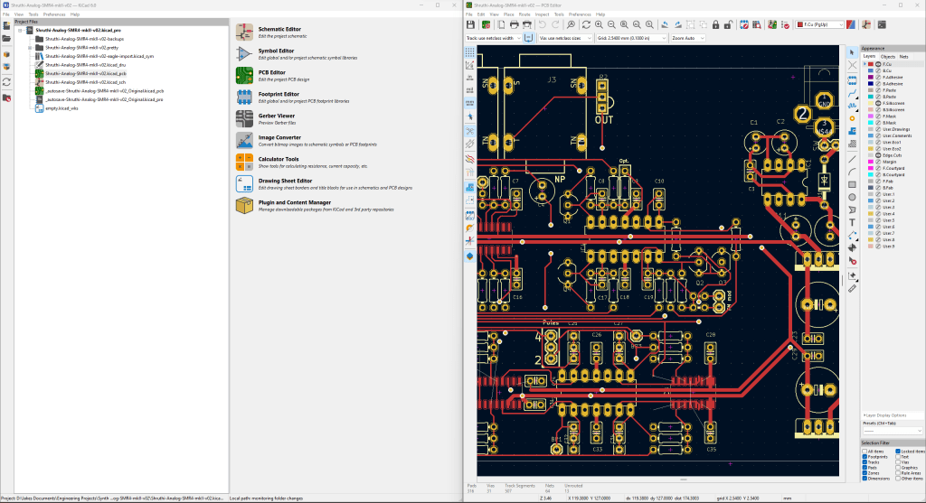 With these two boards chosen the work begins. Kicad in theory supports Eagle file import but not from the old Eagle files used 12 years ago on the Shruthi2.. So to start, I have to open Eagle to get these Eagle 6 boards rolled up to the newest version and spent a few hours installing this Autodesk Eagle combination, opening the files and then saving them again to be current Eagle files. Once that was completed Kicad successfully recognized the files and could import them.