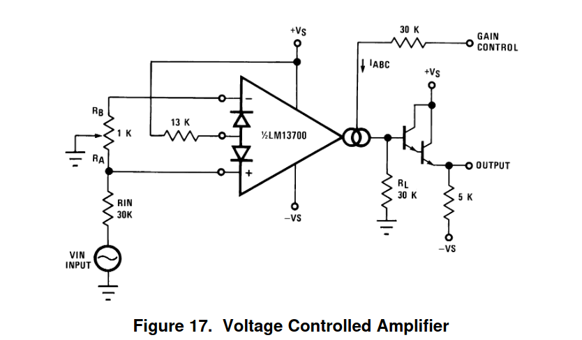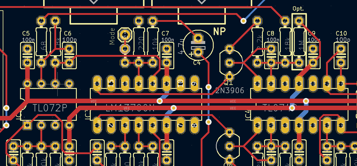 Lets talk about the nitty gritty of the design. So the PWB is quite simple once I got my head around it. It is only a two layer board, with a handful of different through hole parts. Having been the “analog guy” for a few years now the Voltage to current mode transformation of the LM13700 was very interesting. Whats more is that it seems to be a common mode of operation with classic analog synthesizers. Control of the audio signal path is done via potentiometer DC setting the current through these trans conductance amplifiers. This is done both in the gain section of the design as well as the filter section. So the voltage is fixed but the resistance changes and that shifts the level. The diagram below shows an example circuit. So for the gain stage at least its quite obvious that your base current in the output is a function of the gain setting voltage. The current sources used in this application are actually exponential in relationship to the output signal.