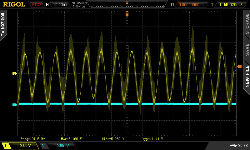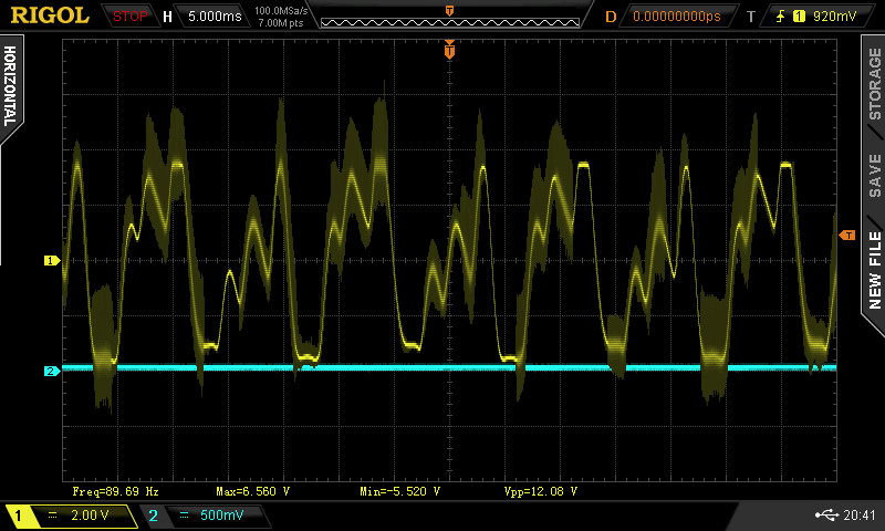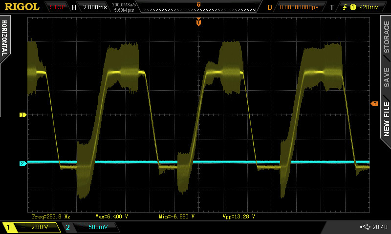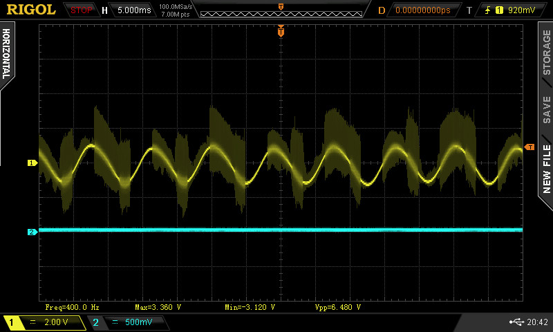 Once the two analog boards were generating some audio, I took some baseline scope shots of the analog output Voltage. Waveforms from the analog out at various synthesizer presets are captured below. Note the “hash” on these waveforms is the PWM (Pulse Width Modulated) signal present in the output. The theory is that once you run the audio through another system that signal should get wiped down. I’m debating whether I want some outboard filtering in addition at some point, but that would be a whole feature.